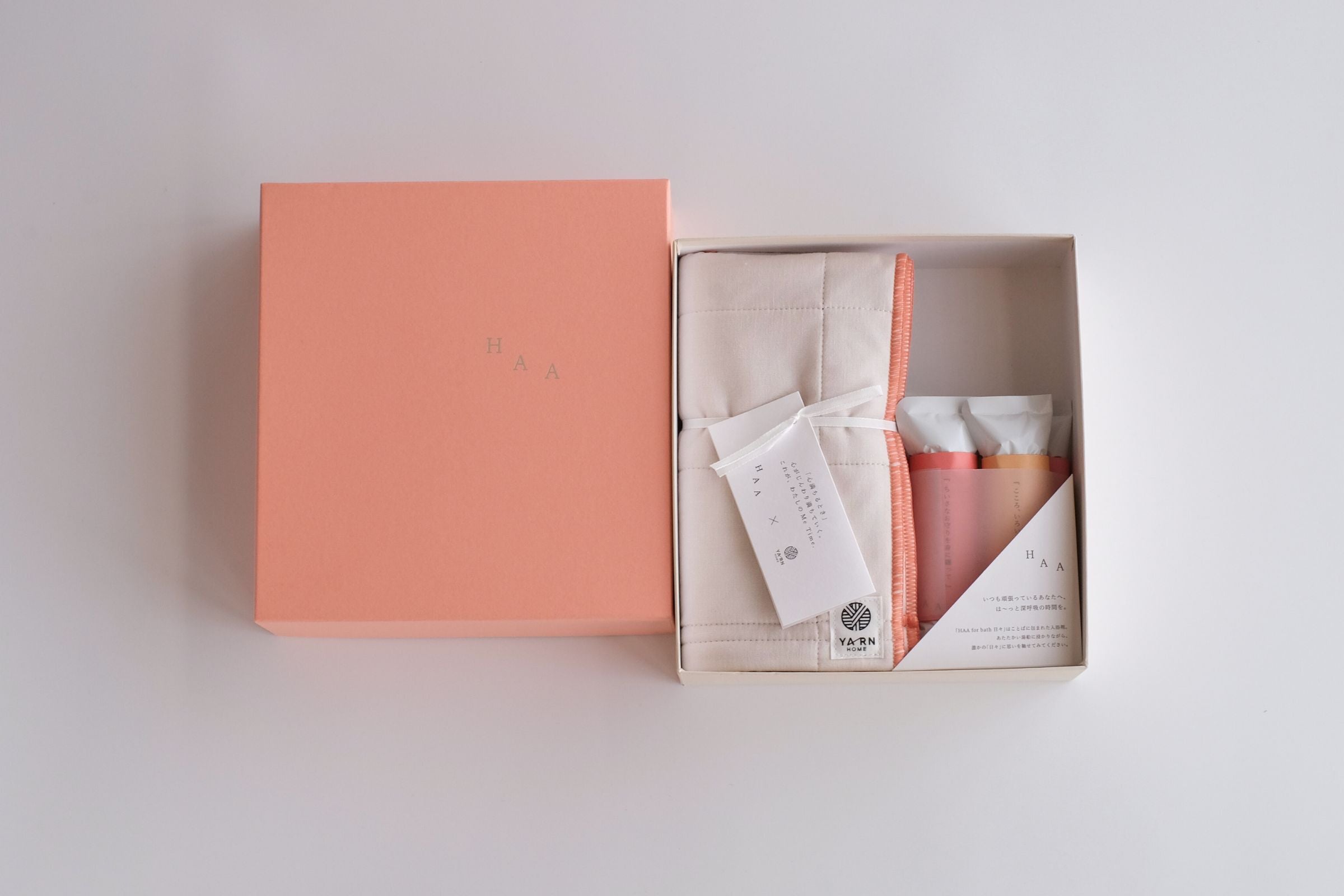 HAAのロゴが添えられたシンプルで上質なギフトボックス。自分へのご褒美にも、大切な人への贈り物にもおすすめです。は~っと深呼吸できるひとときを贈りませんか?