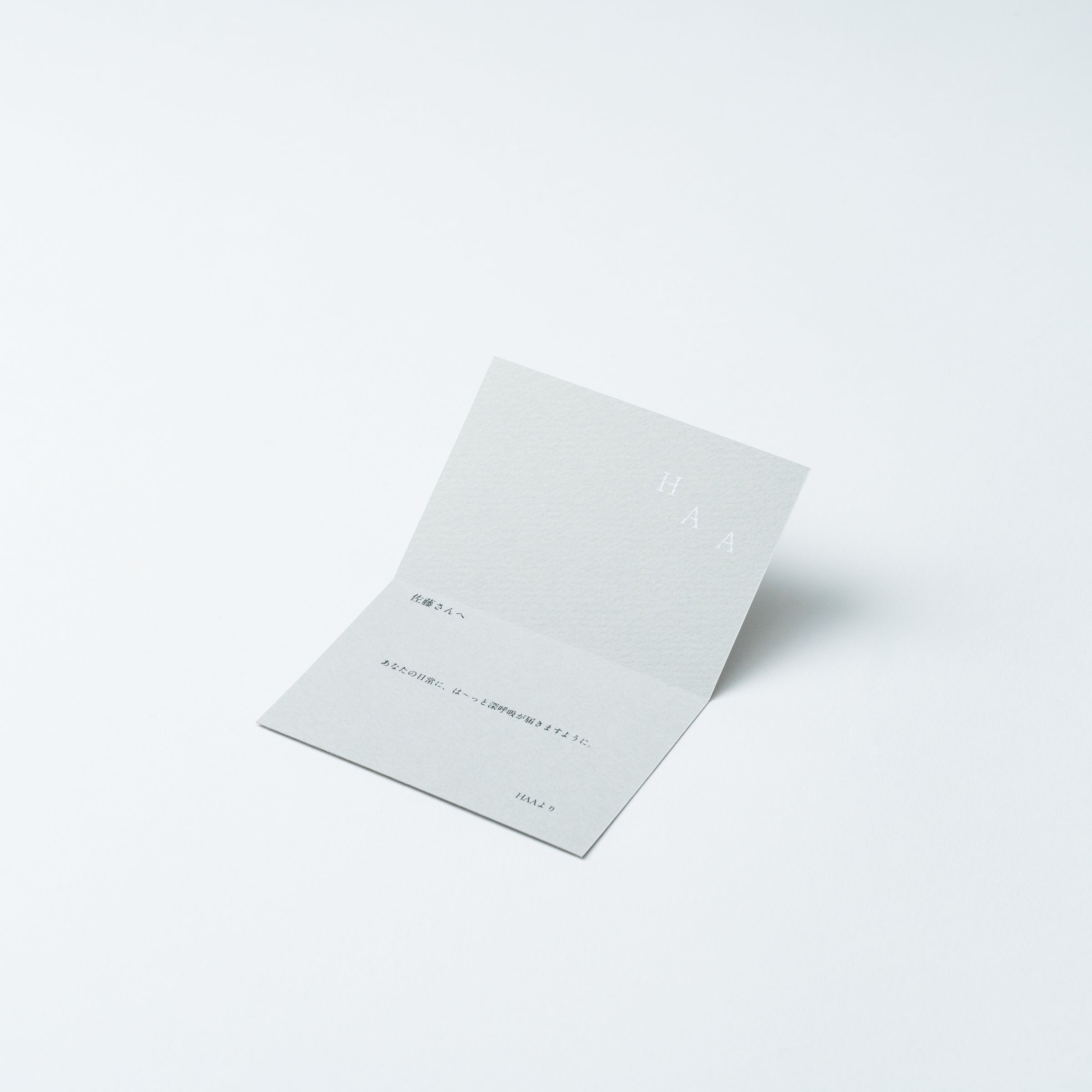 縦126mm × 横90mmの2つ折りのHAAオリジナルメッセージカードです。主役であるメッセージを引き立てるために、ほどよい余白を残し、HAAらしい温もりを感じるデザインに仕上げました。グレーを基調に、HAAロゴやさりげない模様をあしらっています。 ご希望のメッセージを印刷してお届けいたします。